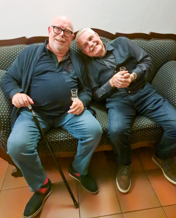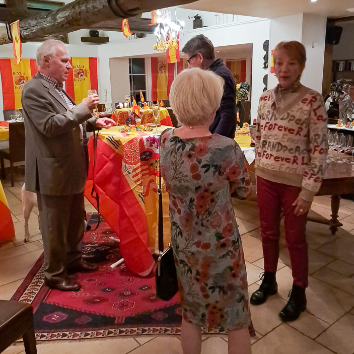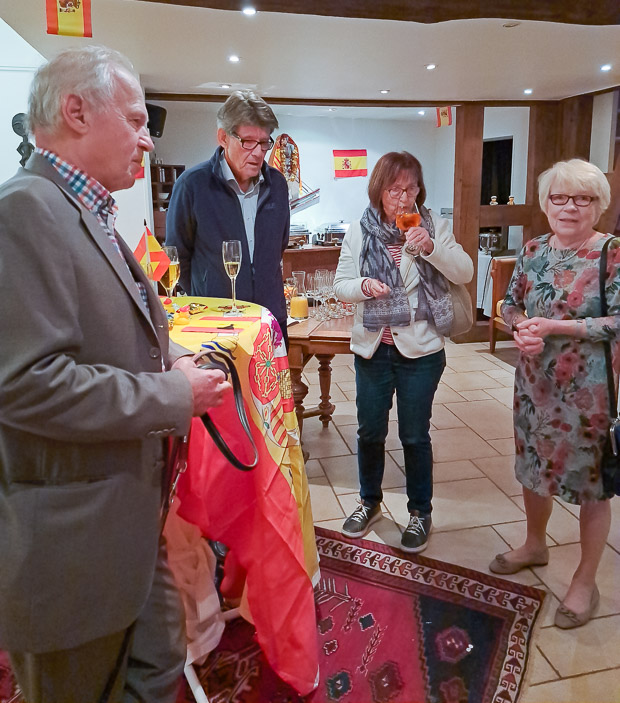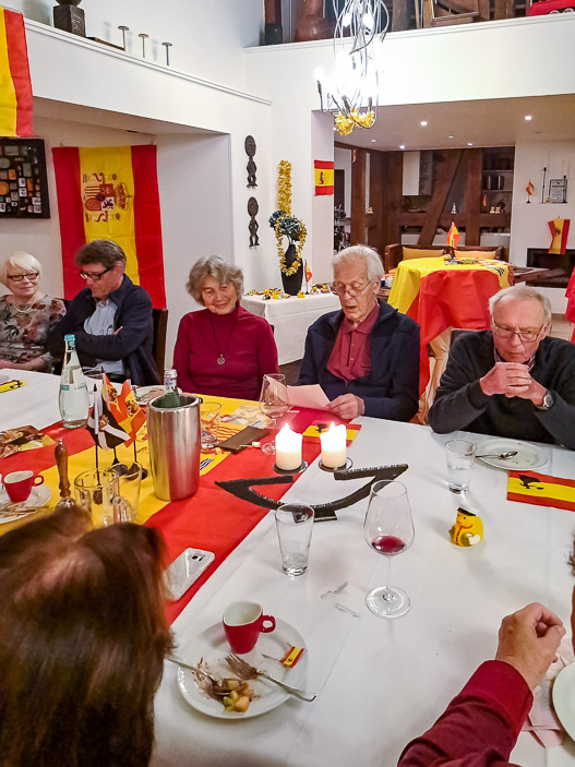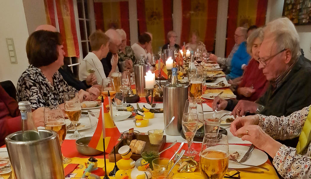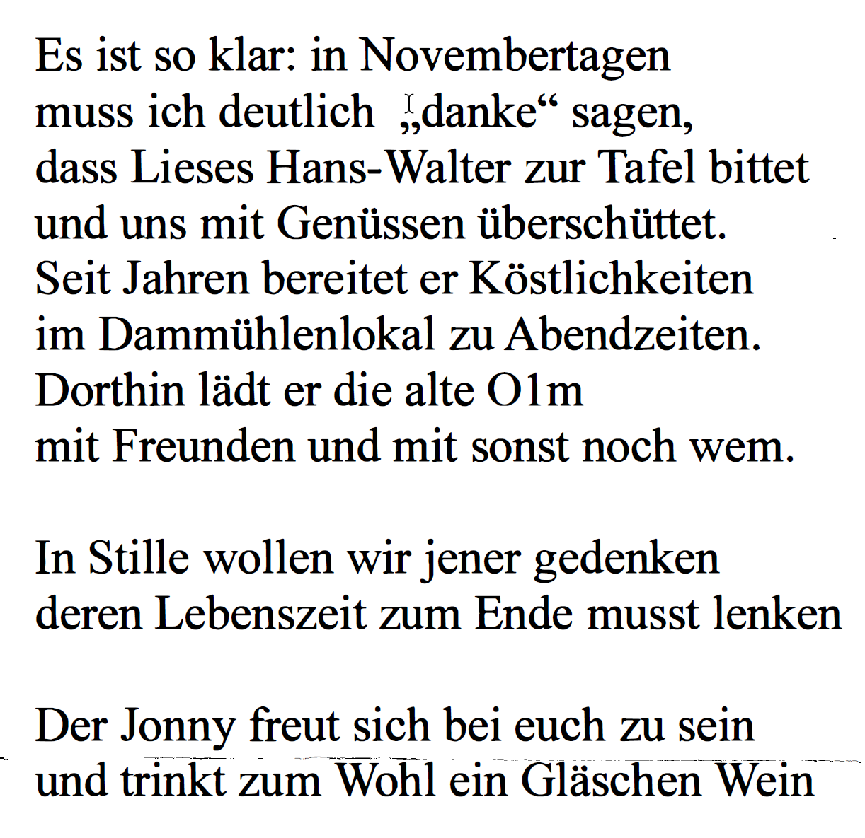 Unser Senior in der Runde, Jonny Verbeek, hat es sich übrigens nicht nehmen lassen, trotz gerade überstandener Krankheit den Weg zur Dammühle auf sich zu nehmen. Und er hat wieder einen Trinkspruch in Form eines Gedichts dabeigehabt. Auf dem Foto rechts sieht man ihn neben seiner Frau Marga beim Vortrag.